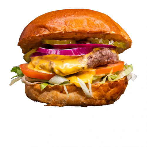Boeuf Charolais ,cheddar fondu, salade iceberg, tomate fraiche, oignons rouges, pickels ,