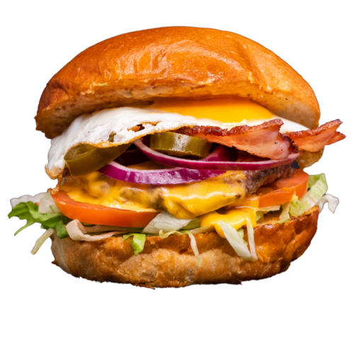 Bœuf charolais, cheddar fondu, salade iceberg, tomate, oignons rouges, œuf au plat, bacon,
